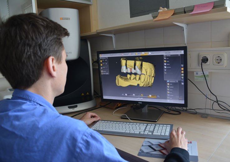 Jeder Zahnersatz, von der einzelnen Keramikkrone bis zur totalen Prothese ist ein Unikat, das von unserem Zahntechnikerteam mit viel handwerklichem Können, fortschrittlicher Technologie und Liebe zum Detail hergestellt wird. Mit modernster CAD/CAM Technik werden in unserem Praxislabor Kronen- und Brückengerüste aus hochfester Zirkon-Keramik erstellt. Die von einer computergesteuerten hochpräzisen Fräsmaschine erstellten Keramikgerüste werden für jeden Patienten individuell verblendet. Um höchste Ansprüche zu erfüllen, muss die Funktionalität, die Passgenauigkeit, eine lange Haltbarkeit, die Bioverträglichkeit der Materialien und vor allem die Ästhetik des Zahnersatzes stimmen.
